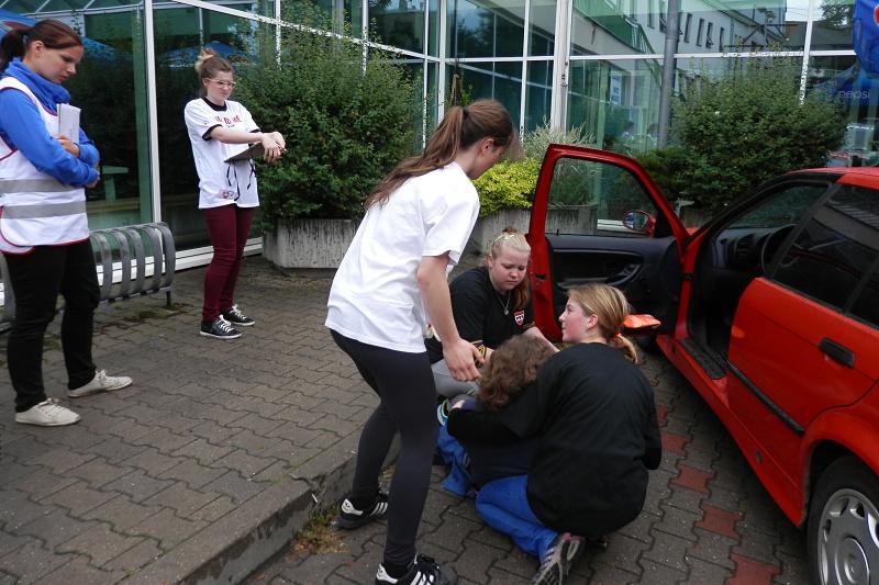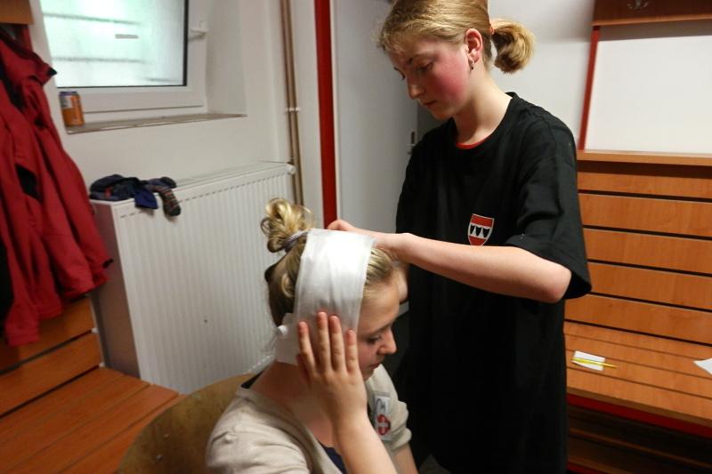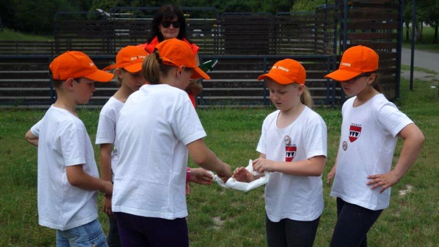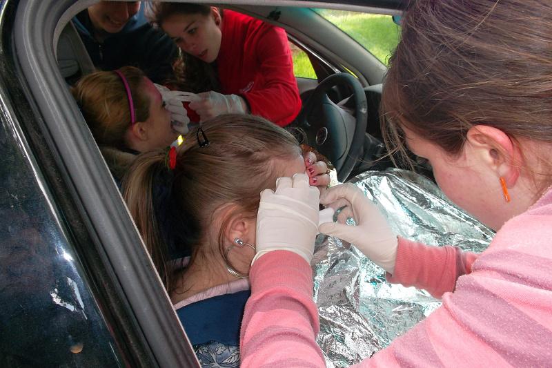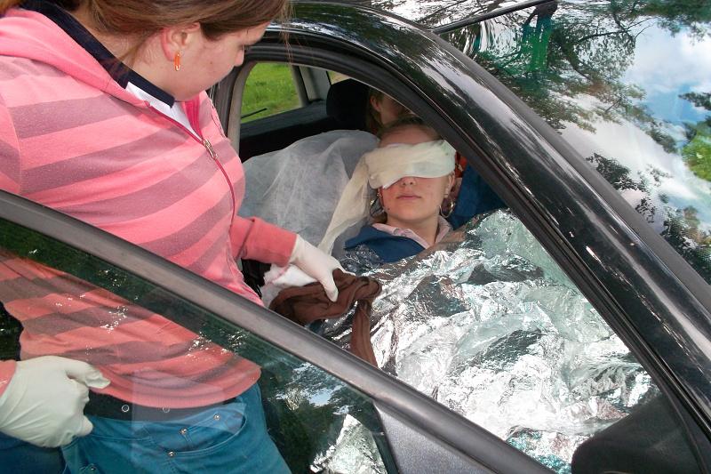 V polovině května naše dvě družstva mladých zdravotníků 1. stupně soutěžila v poskytování první pomoci. Na stanovištích ošetřovala raněné. K nejsložitějším situacím patřila autohavárie s tříčlennou posádkou, ošetření po výbuchu petardy v rukou mladistvých a otrava plynem v garáži.